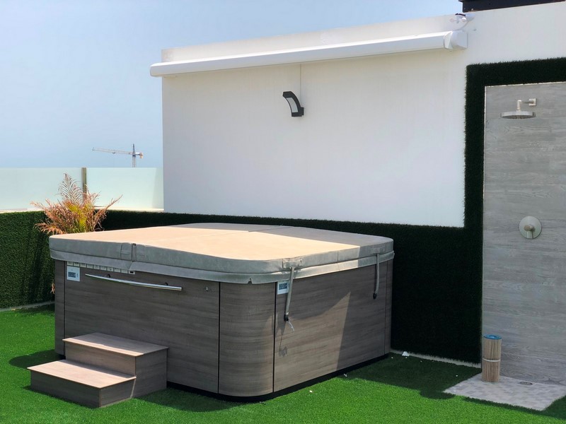 1. Con el brazo extendido, enganchándolos a la barandilla de forma que el toldo nos queda separado de esta, dejando pasar el aire para una mejor ventilación, a la vez que protege del sol.